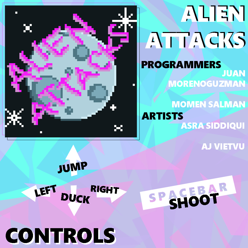 For our final project, we continued on Asra’s and Juan’s prior video game, Alien Attacks! Juan and Momen were the programmers, while Asra and me worked on the art for the game. This is a game where the player controls an alien escaping Area 51 and has to shoot their way through Area 51 policemen!